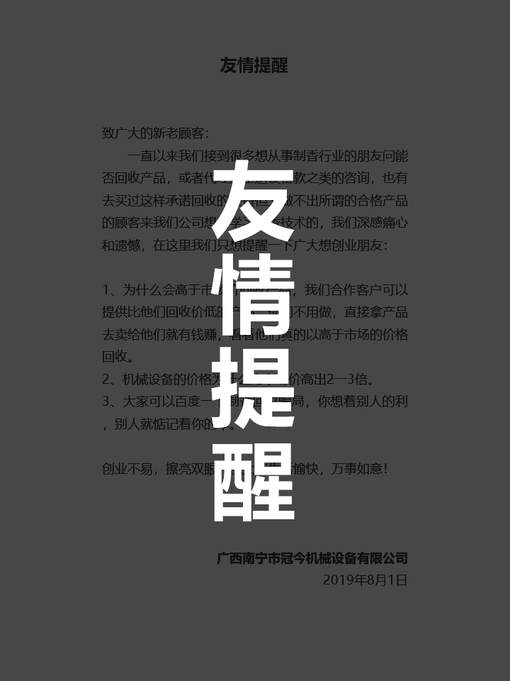 廣西南寧市冠今機(jī)械設(shè)備有限公司(原南寧市富利機(jī)械加工廠)是一家集制香機(jī)械設(shè)備開發(fā)設(shè)計(jì)、香品生產(chǎn)銷售于一體的科技企業(yè),引進(jìn)國際先進(jìn)技術(shù)所研究出來的制香機(jī)設(shè)備是可生產(chǎn)多種類型的衛(wèi)生香,檀香,竹簽香等。擁有大型香業(yè)基地及堅(jiān)實(shí)的硬件基礎(chǔ),在制香機(jī)械領(lǐng)域具有從研發(fā)到批量生產(chǎn)的全方位優(yōu)勢(shì)。
